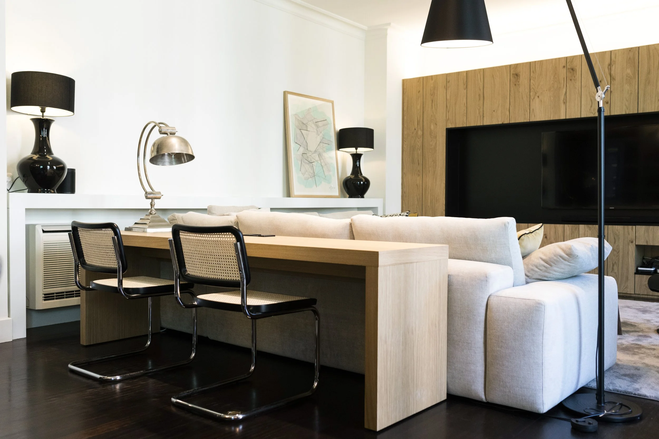 Este apartamento resalta el color negro, presente en la carpintería en primer lugar, y en algunos elementos puntuales repartidos por la casa.